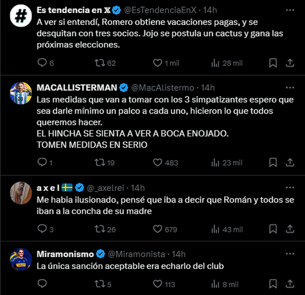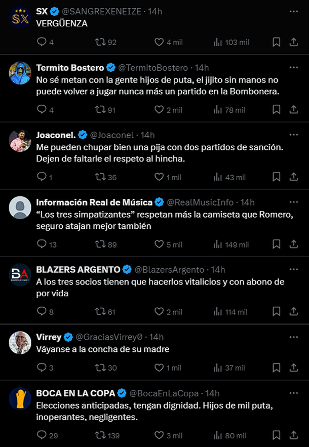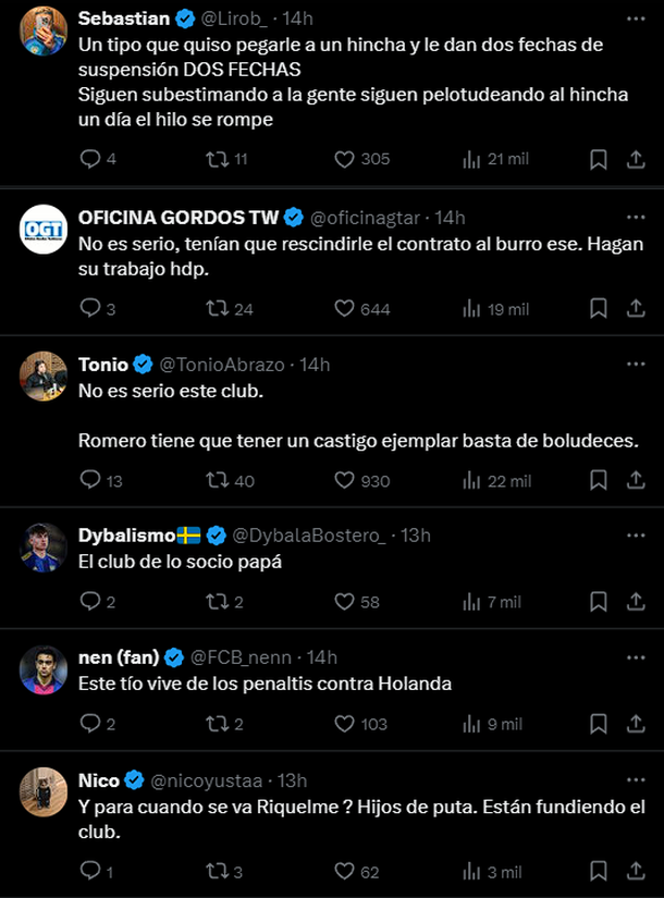 Las respuestas de los simpatizantes no tardaron en llegar: a través de plataformas como X, los hinchas manifestaron su malestar y expresiones como "vergüenza", "inoperantes" y "papelón" dominaron los comentarios, en los que acusaban a las autoridades del club de ser demasiado blandas con Romero y excesivamente severas con los socios implicados en el escándalo.