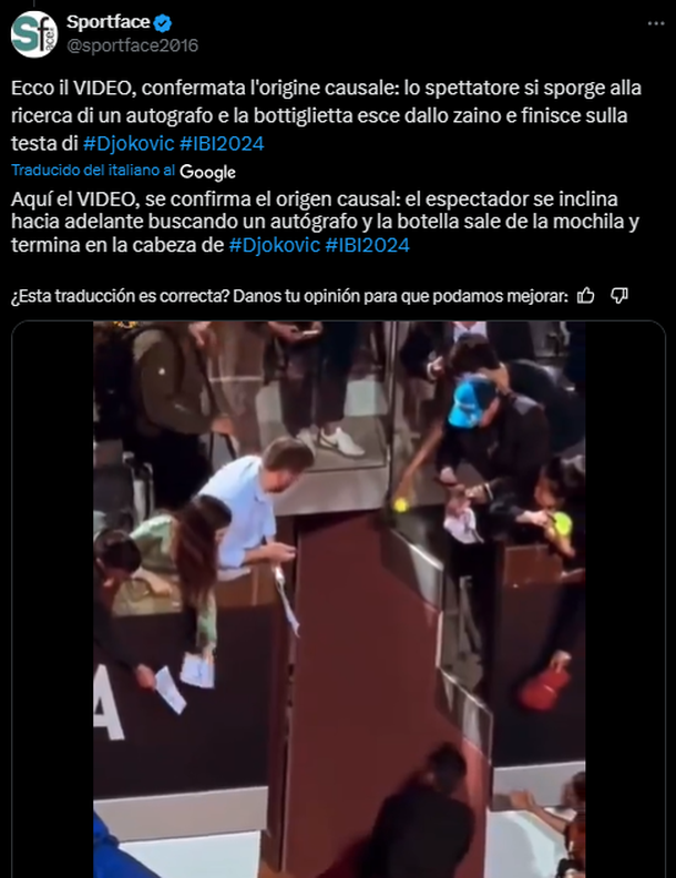 Por el contrario, se trató de un episodio donde "el espectador se inclina hacia adelante buscando un autógrafo y la botella sale de la mochila y termina en la cabeza de Djokovic", según indicaron con un video que confirma esta afirmación.
