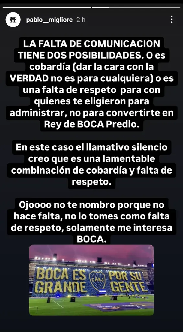Pero no quedó allí. Horas después, volvió a manifestarse con un segundo mensaje, aún más contundente: “La falta de comunicación tiene dos posibilidades: o es cobardía o es una falta de respeto para con quienes te eligieron. En este caso, creo que es una combinación de ambas”. Si bien evitó nombrar directamente a Riquelme, el destinatario de sus palabras quedó claro en el tono y el contenido.