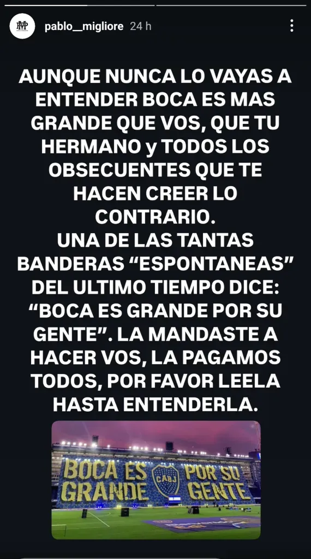 Migliore, exarquero que tuvo un breve pero recordado paso por el Xeneize, utilizó su cuenta de Instagram para descargar su enojo contra la gestión encabezada por el ídolo xeneize. En una publicación cargada de ironía y enojo, lanzó: “Boca es más grande que vos, que tu hermano y que todos los obsecuentes que te hacen creer lo contrario”.