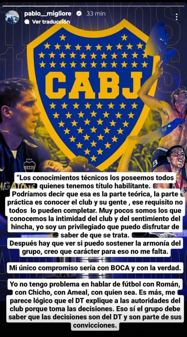 "Los conocimientos técnicos los poseemos todos quienes tenemos título habilitante. Podríamos decir que esa es la parte teórica, la parte práctica es conocer el club y su gente. Ese requisito no todos lo pueden completar", arrancó en una historia en su cuenta de Instagram.
