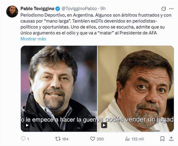El mensaje, publicado en su cuenta de X, se viralizó en cuestión de minutos y reavivó el enfrentamiento entre ambos protagonistas. “Periodismo deportivo en Argentina”, comenzó su publicación Toviggino, con tono sarcástico. A continuación, cuestionó duramente a quienes, según él, se disfrazan de comunicadores para atacar a la actual dirigencia de la AFA: “Ex directores técnicos devenidos en periodistas-políticos y oportunistas”.