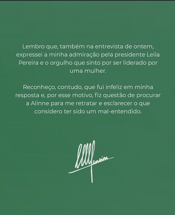 Al ser consultado por la periodista Alinne Fanelli sobre la situación de los jugadores lesionados, Ferreira respondió de manera despectiva, afirmando que solo debía rendir cuentas a tres mujeres: su madre, su esposa y la presidenta del club, Leila Pereira.
