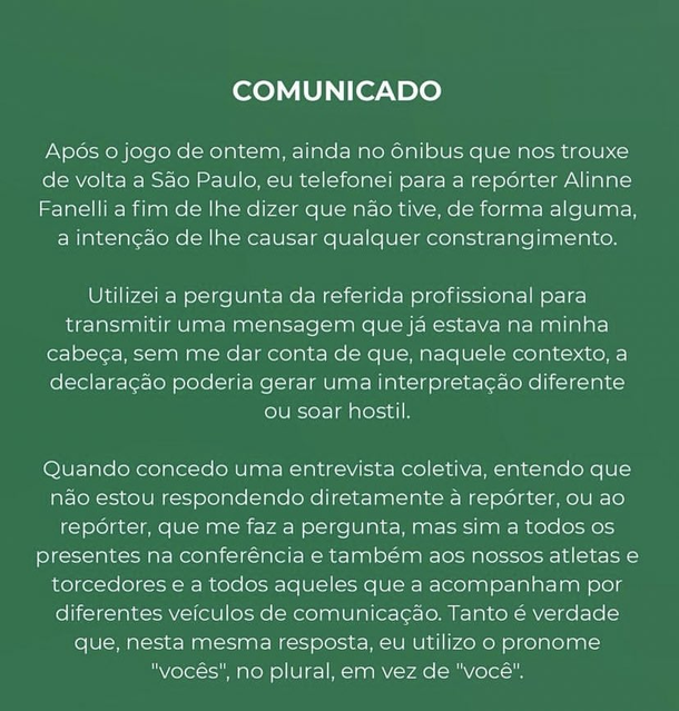 La situación escaló rápidamente, y el medio para el cual trabaja Fanelli, BandNews FM, emitió un comunicado condenando las palabras del entrenador. En la nota oficial, la emisora acusó al técnico de machismo y defendió la labor de su reportera, destacando que "el indiscutible machismo demostrado por el técnico Abel Ferreira es injustificable e indefendible".