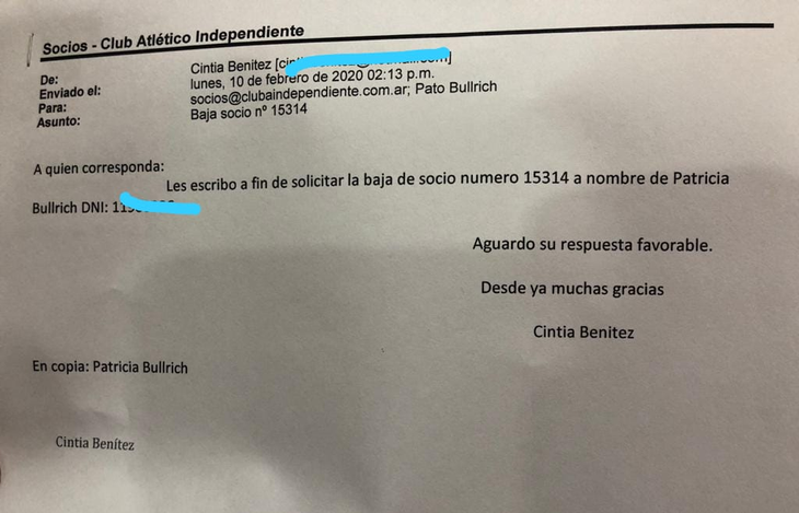 No obstante, circula un mail en el que la ex ministra de Seguridad abandona al "Rojo". Casualmente, su baja se da el 9 de febrero de 2020, un día después de la derrota ante un Racing que de manera épica le ganó con nueve jugadores tras aquel recordado gol del chileno Díaz tras comer una banana en pleno campo de juego.