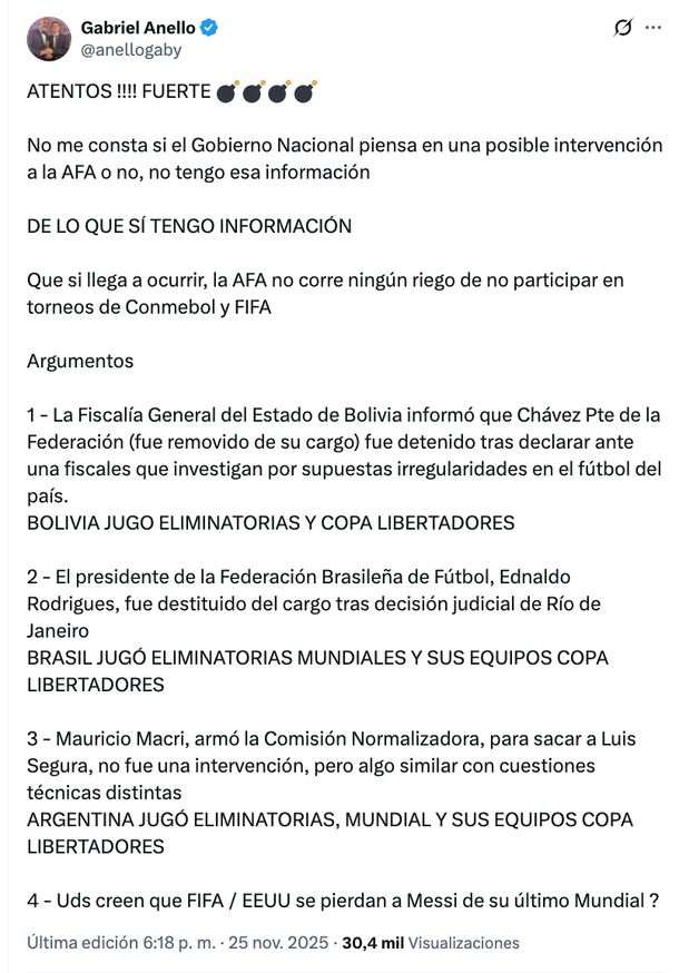 Al respecto, Anello sostuvo en su mensaje que, en caso de que la intervención se concrete, la AFA "no corre ningún riego de no participar en torneos de Conmebol y FIFA", algo de lo que no tiene ni certezas ni datos que lo respalden.