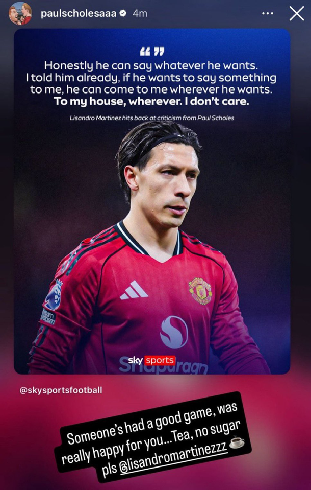 Incluso apeló a la ironía para cerrar su argumento, al señalar que las críticas suelen funcionar como motor anímico: “Las críticas inspiran, creo que debemos atribuirnos parte del mérito por la actuación de Martínez el sábado. Ha tenido un partido brillante, pero cuando empiezas a hablar y a gritar, este juego tiende a venir y morderte el trasero”. Más tarde, Scholes reforzó ese tono en Instagram, donde escribió: “Alguien ha tenido un gran partido. Estoy realmente feliz por ti. El té, sin azúcar, por favor”.
