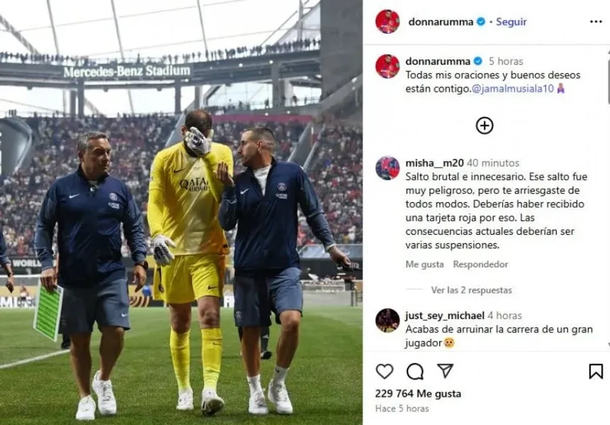 Además, el arquero del PSG publicó un mensaje en sus redes sociales acompañado de una imagen suya visiblemente angustiado: “Todas mis oraciones y buenos deseos están contigo”, escribió en su cuenta de Instagram, intentando llevar algo de consuelo al joven volante.
