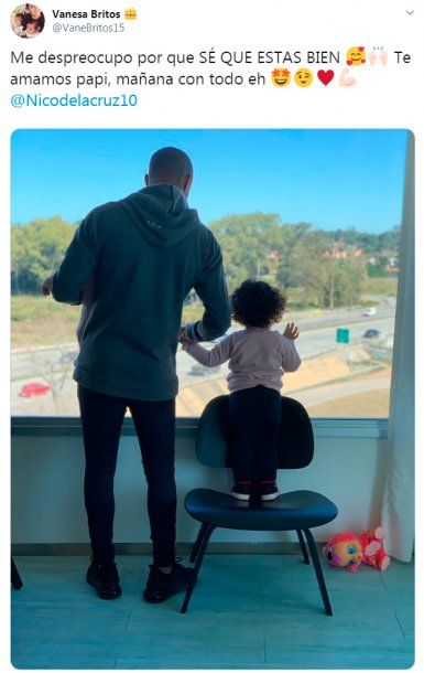 Ante la incertidumbre sobre qué sucederá con el jugador en las próximas horas, Vanesa Britos, mujer del futbolista, escribió unas palabras en las redes sociales con una foto de De La Cruz sosteniendo a una de sus hijas.
