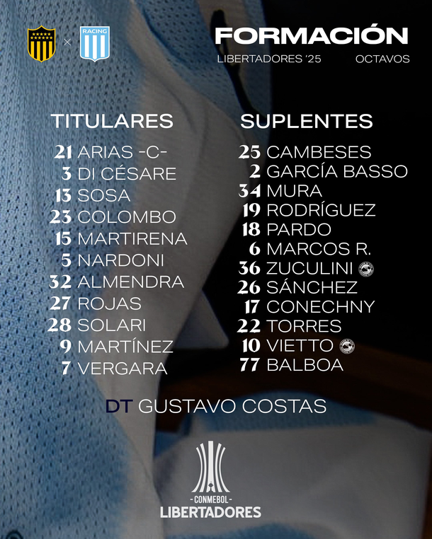 La alineación de Racing para visitar a Peñarol por la Copa Libertadores