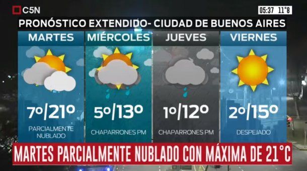 El organismo prevé una jornada con cielo algo nublado por la mañana, luego parcial y mayormente nublado, vientos del sector norte rotando al noroeste, suroeste y sur, y una temperatura mínima que será de 9 grados y luego alcanzará los 21 grados de máxima, el día más caluroso de la semana.