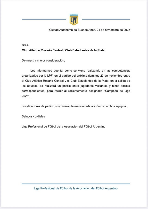 La comunicación, emitida por la Liga Profesional de Fútbol, no dejó lugar a dudas sobre la instrucción para el partido del domingo 23 de noviembre. "Tal como se viene realizando en las competencias organizadas por la LPF, en el partido del próximo domingo 23 de noviembre entre el Club Atlético Rosario Central y el Club Estudiantes de la Plata, en la salida de los equipos, se realizará un pasillo entre jugadores visitantes y niños escolta correspondientes, para recibir al recientemente designado Campeón de Liga 2025", indicó.