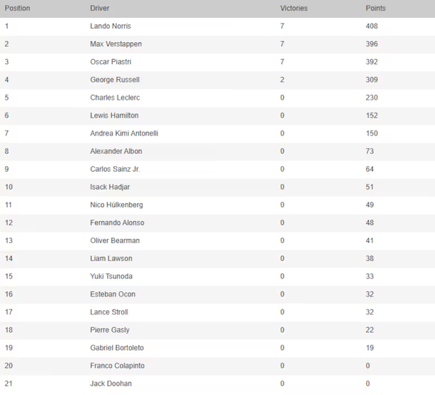 - Es 6º o 7º y no ganan ni Verstappen ni Piastri (empatarían en 414 puntos, pero Norris tiene más segundos puestos).
