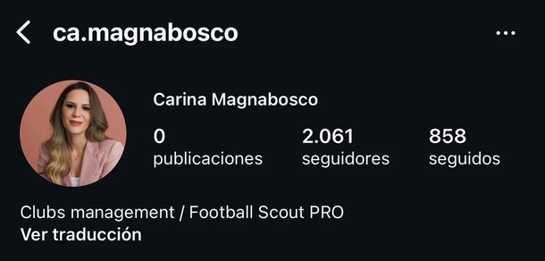 Carina Magnabosco se presenta en sus redes sociales como “Football Scout PRO” y asegura estar certificada por FIFA, además de especializarse en derecho deportivo, análisis y gestión. Nacida en Brasil, fue apodada por la revista Showroom News Magazine como “La Barbie del fútbol”.