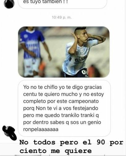 Ante esto, como suele hacer cada vez que es noticia, el jugador de 26 años eligió las redes sociales para expresarse. En una historia de Instagram compartió una foto de un mensaje de apoyo que le mandó un hincha y escribió: "No todos, pero el 90% me quiere".