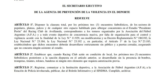 De todos modos, queda abierta la posibilidad de apelación por parte del club, y restará conocerse si Racing logra achicar la prohibición de cara al cierre del año.