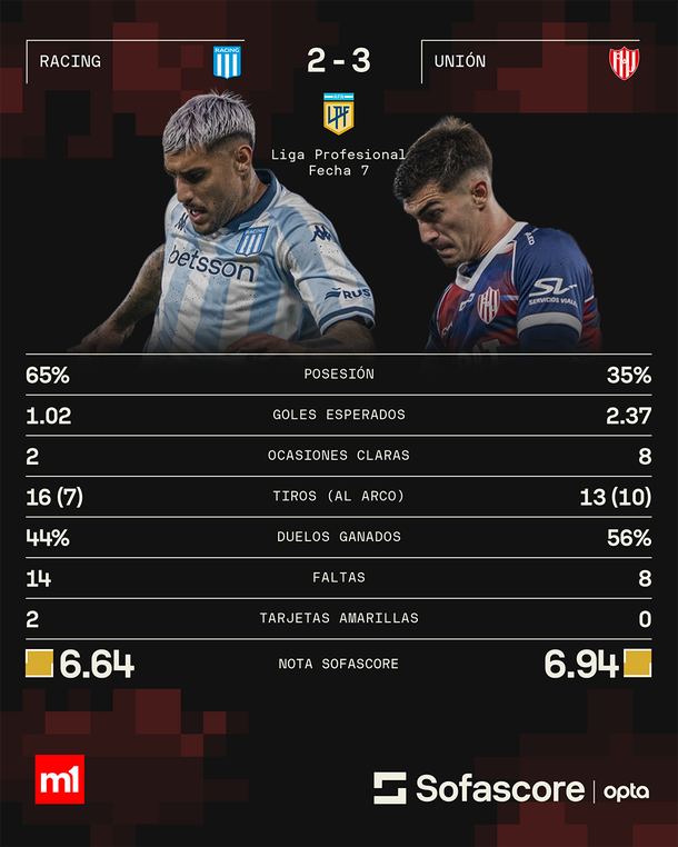 Unión de Santa Fe dio el golpe este domingo y se impuso 3-2 ante Racing en el Estadio Presidente Perón, por la séptima fecha del Torneo Clausura 2025 de la Liga Profesional de Fútbol.