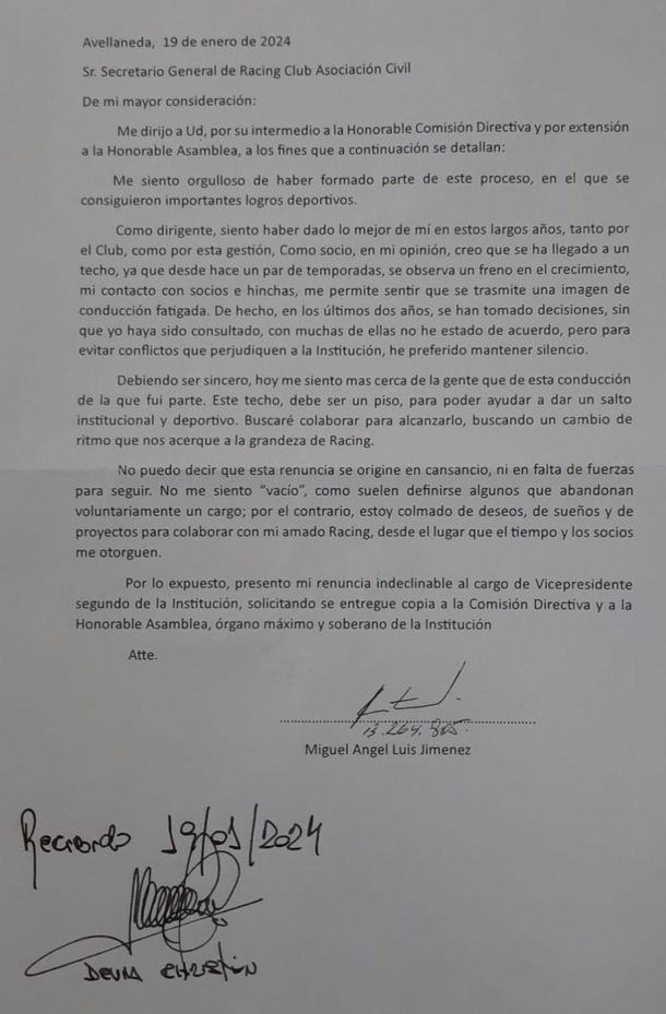 Racing confirmó este lunes la "renuncia indeclinable" del vicepresidente segundo Miguel Jiménez, quien presentó una carta dirigida a la comisión directiva que encabeza Víctor Blanco.