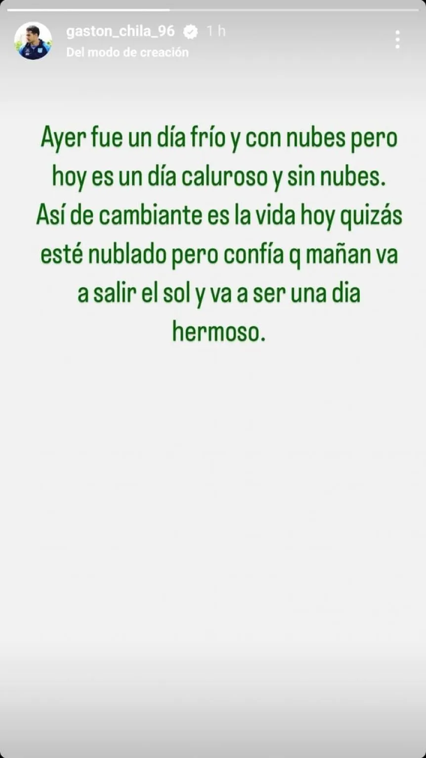 "Ayer fue un día frío y con nubes, pero hoy es un día caluroso y sin nubes. Así de cambiante es la vida, hoy quizás esté nublado, pero confía en que mañana va a salir el sol y va a ser un día hermoso", escribió Gómez en una historia de Instagram.