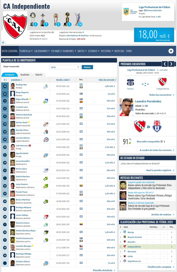 Según TransferMarkt, la cotización actual de los 25 profesionales del "Rojo" alcanza los 18 millones de euros. El más cotizado es Sergio Barreto (2,7 millones) y le sigue el flamante arquero Rodrigo Rey que llegó como libre de Gimnasia y Esgrima de La Plata y vale 1,8 millones.