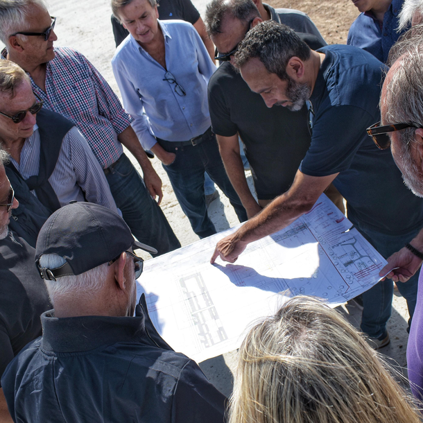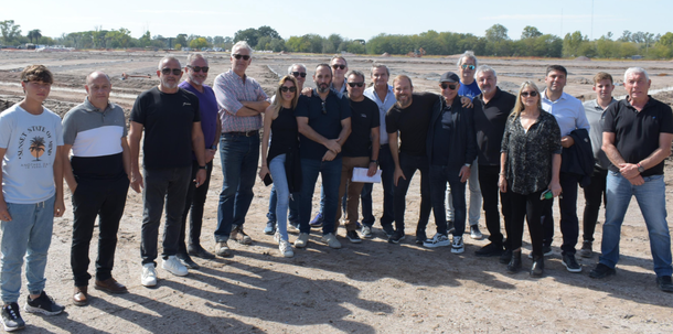 El presidente de Racing, Víctor Blanco, junto a su vicepresidente, Alfredo Chiodini, el Secretario General, Christian Devia, la Secretaria del Club, Bárbara Blanco, y otros integrantes de la Comisión Directiva, como Daniel García, recorrieron las obras del Centro de Alto Rendimiento Deportivo que se está construyendo en Ezeiza.