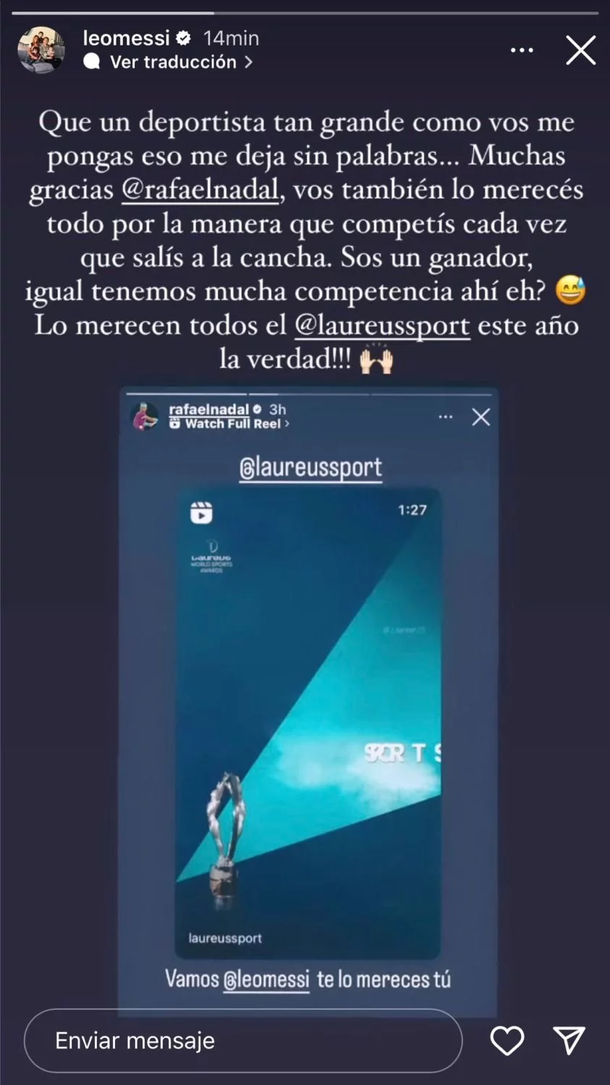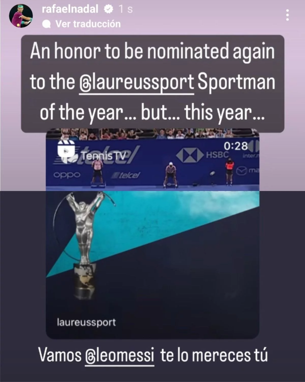 "Es un honor estar nominado nuevamente en el Laureus como deportista del año pero, este año Lionel Messi te lo mereces", escribió Nadal en su cuenta de Instagram.