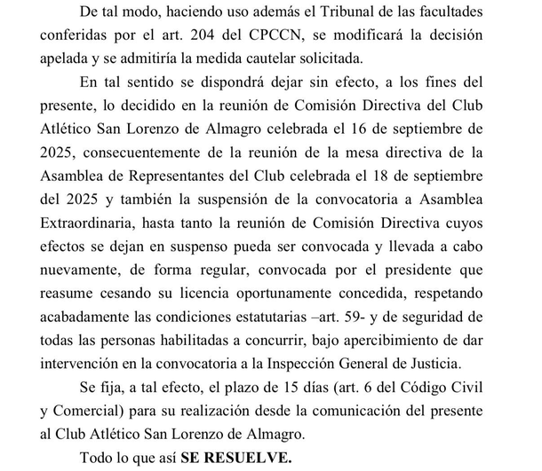 El fallo representa un nuevo giro en la crisis institucional del club, que atraviesa semanas de fuerte tensión tras las renuncias de varios integrantes de la CD y la posterior declaración de acefalía que había derivado en un gobierno de transición.