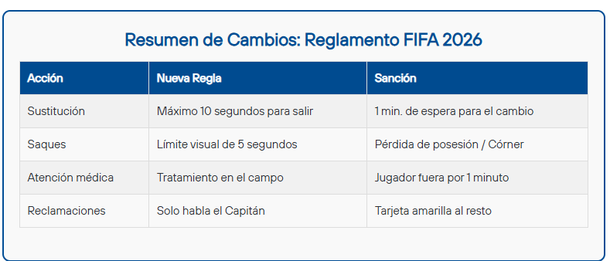 Con estas modificaciones, el organismo rector del fútbol pretende lograr partidos más dinámicos y con menos interrupciones, apostando por un mayor tiempo efectivo de juego en la Copa del Mundo que se disputará en Norteamérica.