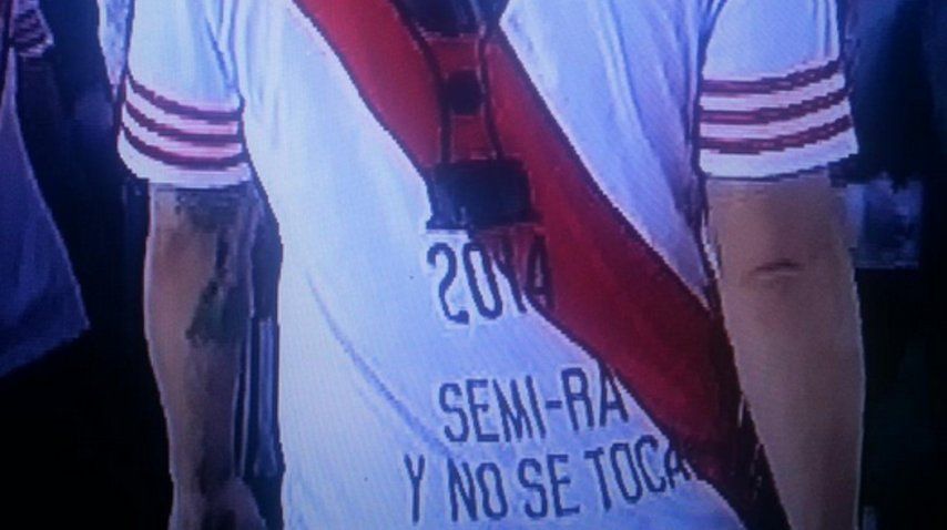 "SEMI-RA y no se toca", reza la camiseta que utilizaron los futbolistas "millonarios" en la coronación en la Copa Sudamericana, en alusión a la eliminación de Boca.