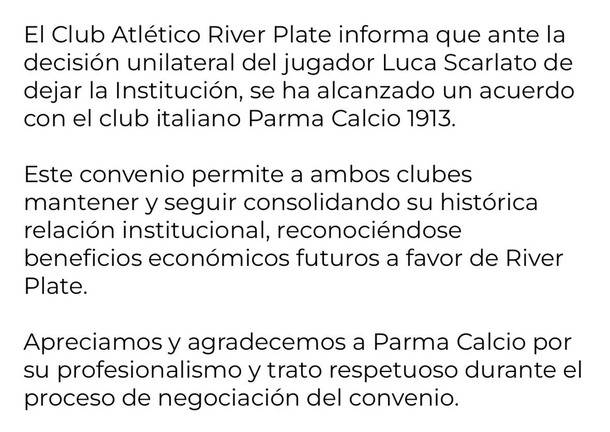 En el texto difundido, la institución expresó: “El Club Atlético River Plate informa que ante la decisión unilateral del jugador Luca Scarlato de dejar la Institución, se ha alcanzado un acuerdo con el club italiano Parma Calcio 1913”. Además, destacó que el entendimiento permite “mantener y seguir consolidando su histórica relación institucional”.