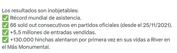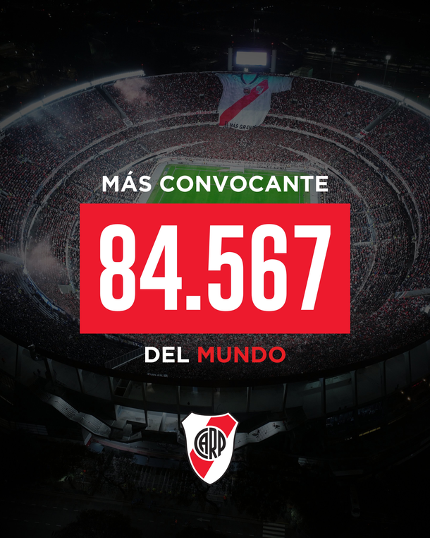 "84.567 - ¿Cómo logramos ser los más convocantes del planeta? Ubicarnos en el primer lugar de convocatoria entre los 3.425 clubes que integran la FIFA es el resultado de una estrategia pensada, trabajada y en constante evolución para integrar a los 25 millones de hinchas alrededor del mundo con el Club. El objetivo final: ratificar a River como principal representante y líder de la región en la élite del fútbol mundial", explicó a través de sus redes sociales Di Carlo.