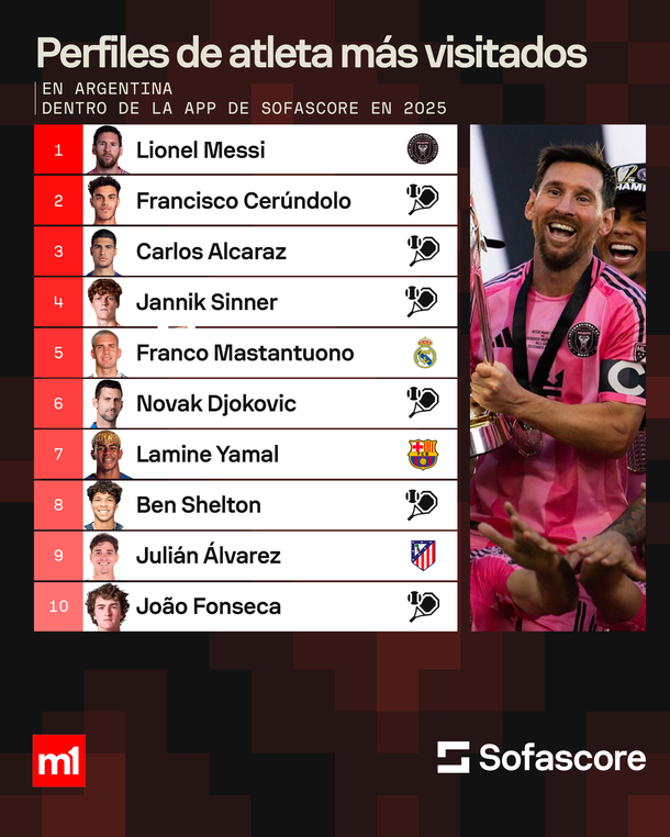 En el ranking de atletas más visitados, Lionel Messi se mantiene en el primer lugar, consolidando su influencia. Sin embargo, la gran sorpresa es la fuerte irrupción del tenis: seis tenistas se encuentran en el Top 10 de atletas.