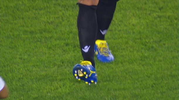 Esta noche, en la ida de la semifinal de la Copa Libertadores sorprendió saliendo al Monumental con botines de color azul y amarillos.