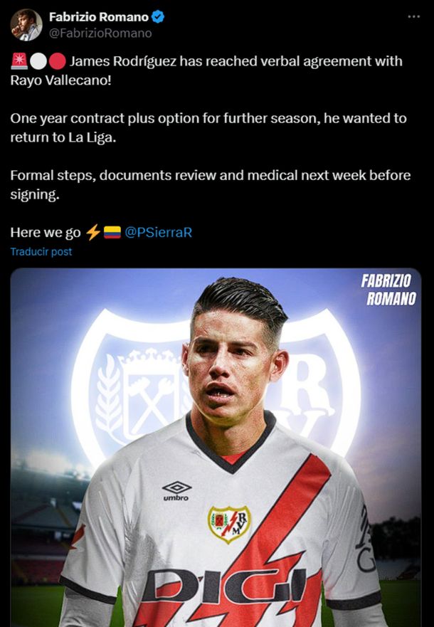 "¡James Rodríguez ha llegado a un acuerdo verbal con el Rayo Vallecano! Un año de contrato más opción a otra temporada. Quería volver a La Liga. Trámites formales, revisión de documentos y médico la próxima semana antes de firmar. Allá vamos", expresó el colega en sus redes sociales, confirmando así la noticia que pone fin a las especulaciones sobre el futuro del jugador.