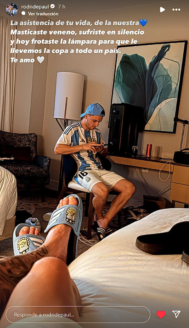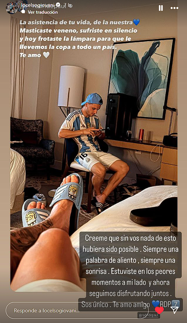 En su cuenta de Instagram, el "Motorcito" publicó una foto de "Gio" descansando en la habitación de la concentración y acompañó la imagen con un emotivo mensaje. "La asistencia de tu vida, de la nuestra. Masticaste veneno, sufriste en silencio y hoy frotaste la lámpara para que le llevemos la copa a todo un país. Te amo", escribió De Paul, reconociendo el arduo camino recorrido por Lo Celso.
