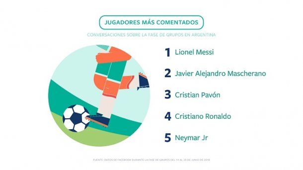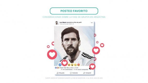 Lionel Messi fue el futbolista más comentado del mundo en Facebook durante la primera fase de Rusia 2018. Sin ir más lejos, un posteo de su perfil recibió 1,4 millones de reacciones, 54 mil comentarios y fue compartido más de 17 mil veces. Esta publicación fue la que generó más reacciones de “Me gusta” en todo el planeta alrededor de la fase de grupos. En el ranking lo siguieron Neymar Jr., Cristiano Ronaldo, Philippe Coutinho y Mohamed Salah.