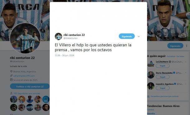 El mediocampista de Racing, que estuvo en la lista de 35 preseleccionados y se terminó quedando afuera, tuiteó en el momento justo en que Argentina no encontraba el rumbo ante Islandia.