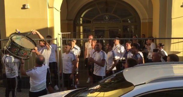El plantel de la Selección participó del banderazo organizado por los fanáticos que se acercaron a la puerta del hotel en San Petersburgo.
