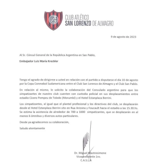 Asimismo, como se difundió en diversos videos, San Lorenzo repudia el trato recibido por parte de la seguridad y de los espectadores locales. Por último, el Club agradece la predisposición del Consulado y Embajada argentina que se hicieron presentes en el lugar y están colaborando con el estado y la situación procesal de los detenidos, junto con tres dirigentes de la institución que a partir de lo sucedido permanecen en San Pablo. San Lorenzo, fiel a su historia, se manifiesta a favor de un fútbol en paz y en contra de cualquier hecho discriminatorio.