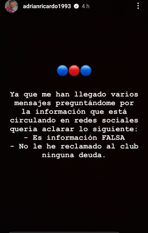 Rumores indicaban que el futbolista de 29 años no estaba concentrando debido a la falta de pago por parte de los directivos, pero salió a desmentirlo a través de su perfil de Instagram: “Ya que me han llegado varios mensajes preguntándome por la información que está circulando en redes sociales quería aclarar lo siguiente: Es información falsa. No le he reclamado al club ninguna deuda”.
