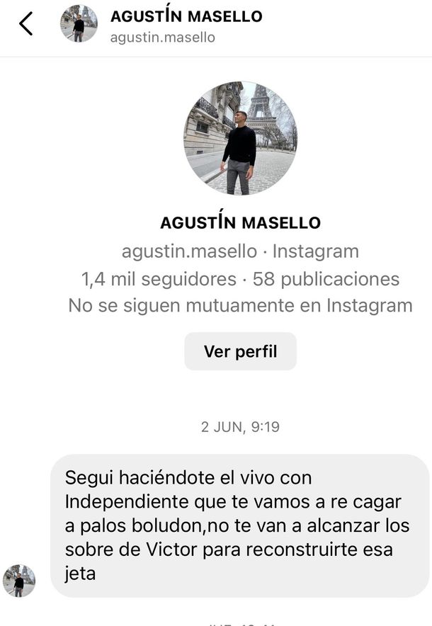 “Seguí haciéndote el vivo con Independiente que te vamos a re cagar a palos boludos. No te van a alcanzar los sobres de Víctor para reconstruirte esa jeta”, dice un mensaje enviado el 2 de junio pasado, el cual ace referencia a Víctor Blanco, presidente de Racing.