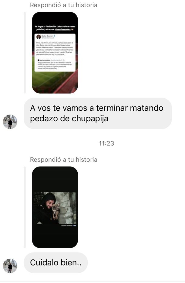 Otros mensajes sin fechas especificadas pero enviadas por el mismo usuario, agregan: “A vos te vamos a terminar matando pedazo de chu...”, y un “cuidado bien”, como respuesta a una foto donde aparecía Genovart con su perro.
