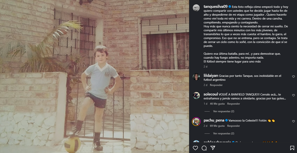 Silva acompañó su anuncio con una foto de su infancia, con una pelota de fútbol en los pies. En el texto que publicó, se sinceró: “Hoy siento la necesidad de cerrar este sueño. De compartir mis últimos minutos con los más jóvenes y transmitirles el hambre, la garra, el compromiso. Eso que no se entrena, pero se contagia”.