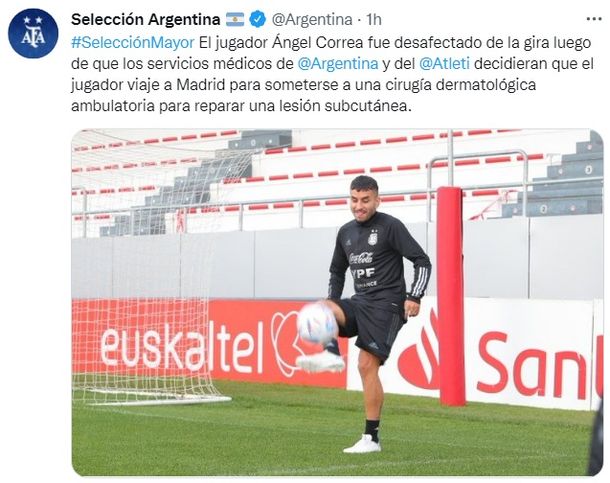 "El jugador Ángel Correa fue desafectado de la gira luego de que los servicios médicos de Argentina y del Atlético de Madrid decidieran que el jugador viaje a Madrid para someterse a una cirugía dermatológica ambulatoria para reparar una lesión subcutánea", informaron.