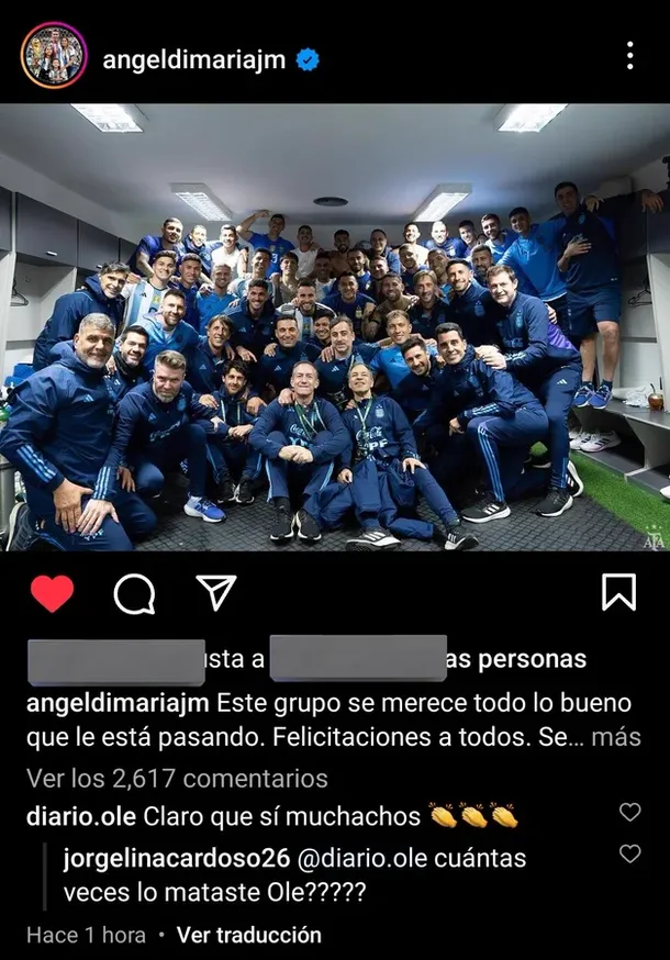 El portal deportivo Olé, por medio de su Instagram oficial aprovechó la publicación para elogiar a Di María y al equipo con un “Claro que sí muchachos” que no pasó desapercibido para Jorgelina. Lejos de agradecer el mensaje, la esposa de Angelito recordó: “Cuántas veces lo mataste, Olé”.