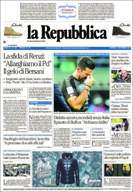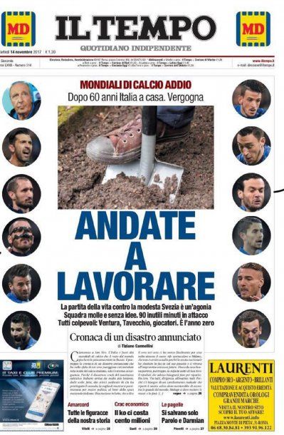 Italia quedó afuera de un mundial por segunda vez en su historia, la anterior había sido en Suecia ’58. Pero los diarios italianos se hicieron eco de semejante mazazo de distinta forma.