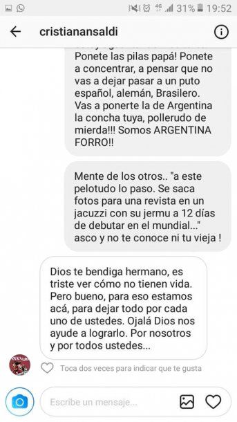 “Ponete las pilas papá. Ponete a concentrar, a pensar que no vas a dejar pasar a un puto español, alemán, brasilero“, cuestionó uno de los seguidores de Ansaldi.