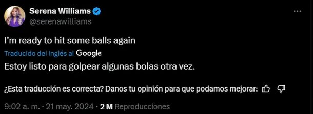 El escueto mensaje no tardó en recorrer las redes sociales, donde los usuarios han insinuado una posible vuelta a las canchas, mientras que otros consideran que se puede deber a algún spot publicitario. Habrá que ver cuánto tarda Serena Williams en develar sus verdaderas intenciones después de lanzar una frase que ha retumbado en el mundo del tenis.