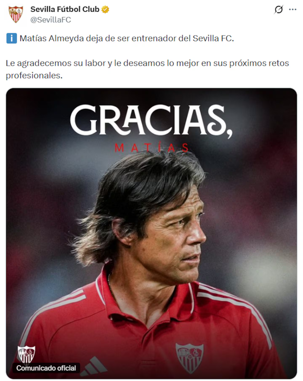 El Sevilla FC desea agradecer el trabajo de Matías Almeyda y su equipo en estos meses y le desea la mejor de las suertes en sus próximos retos profesionales".