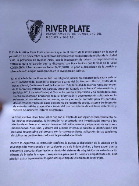 El viernes pasado, además, River envió un comunicado de prensa en el que se puso a disposición de la Justicia, para "colaborar para el esclarecimiento los hechos ocurridos".